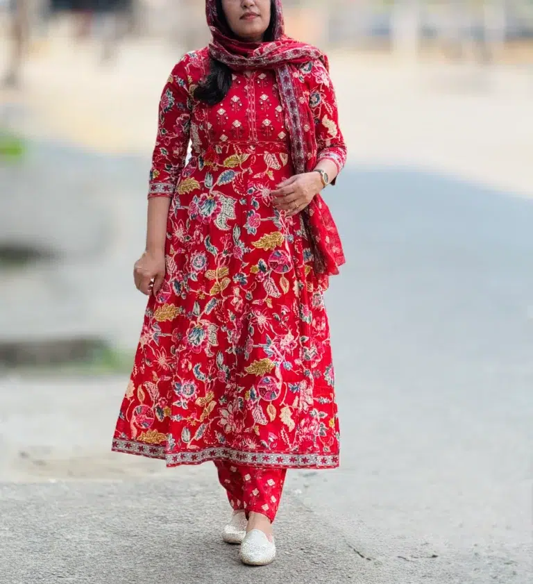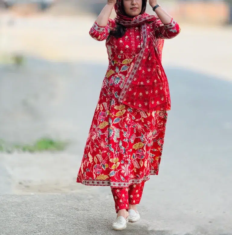Designer Bagru Red Block Print Kurti Pant Dupatta Set
